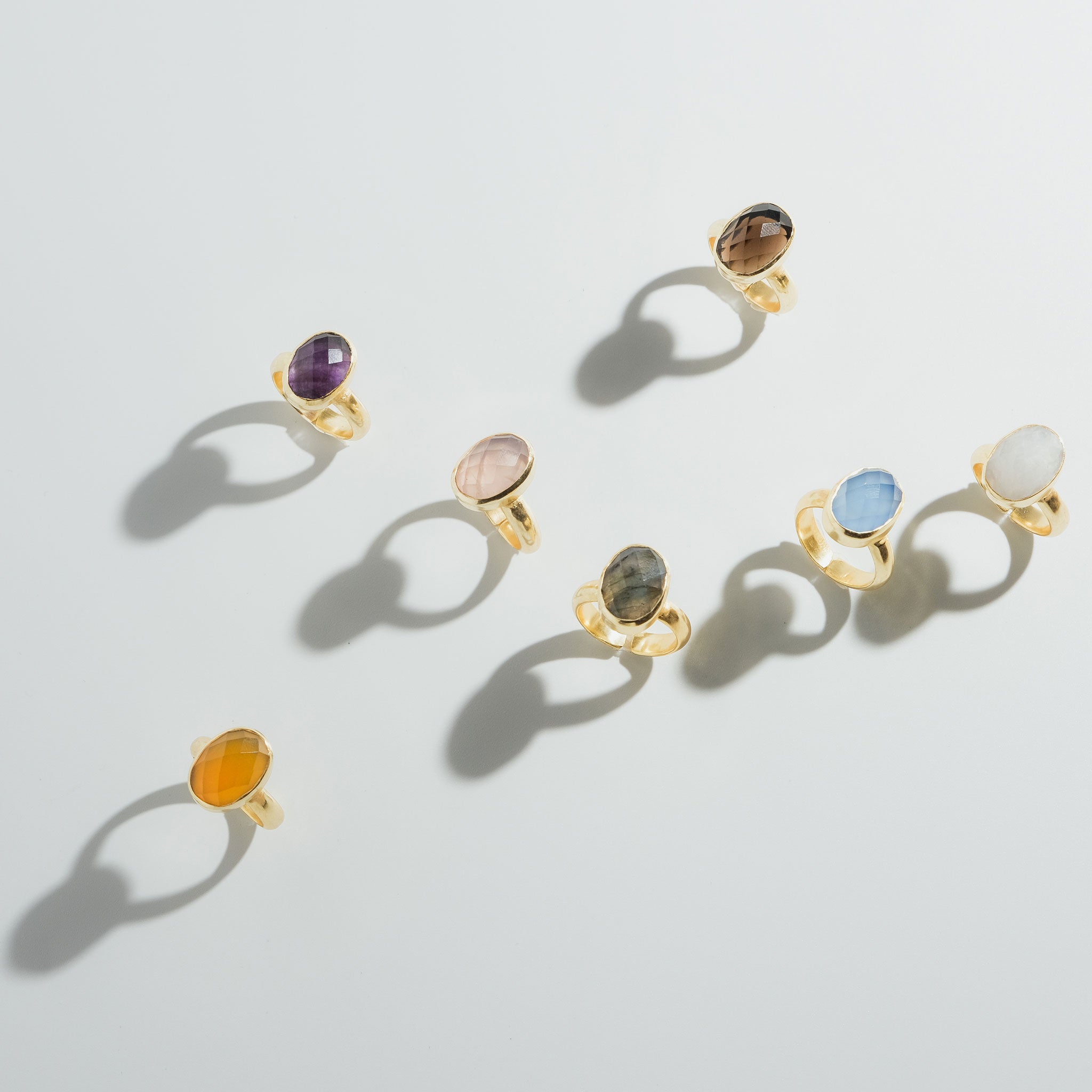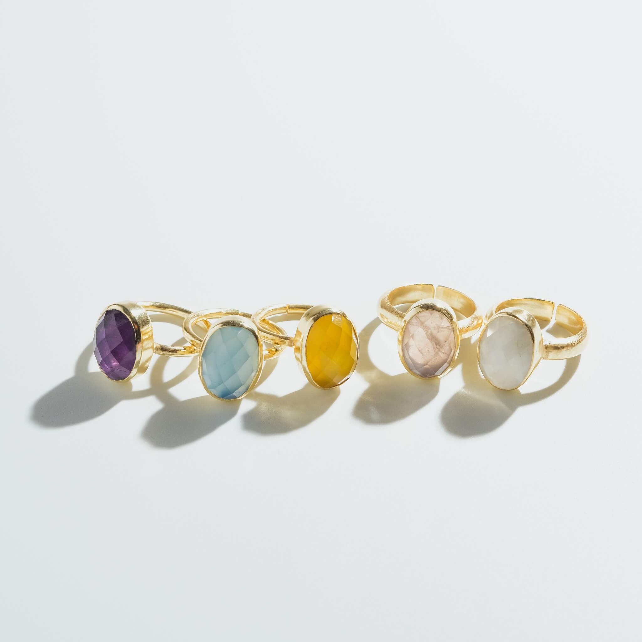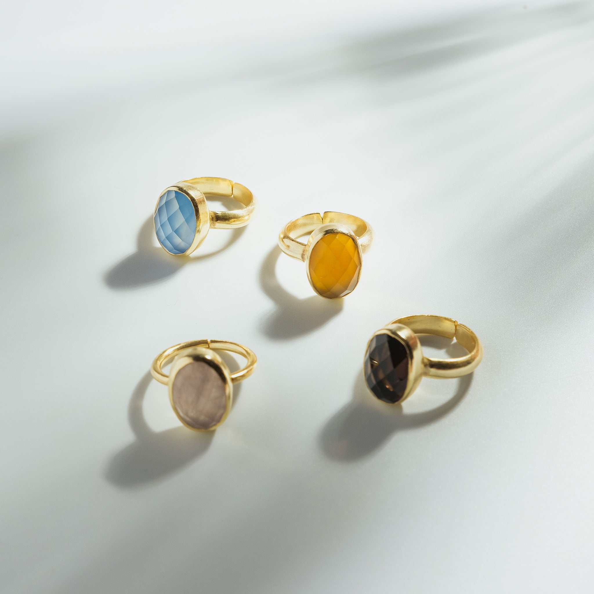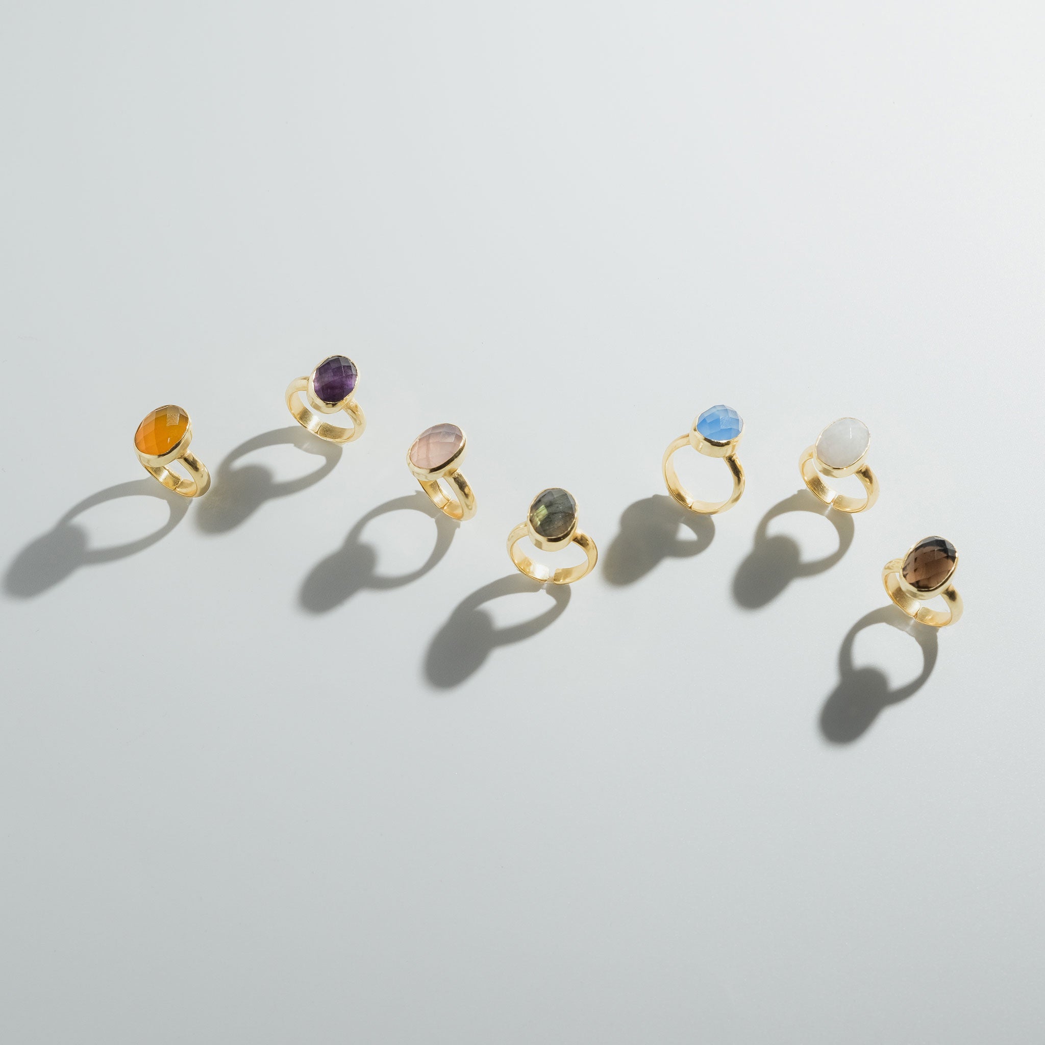 シンプルなフォルムの中に、天然石の個性と輝きが詰まったリング。光を受けるたびに異なる表情を見せるファセットカットが、指先を美しく彩ります。