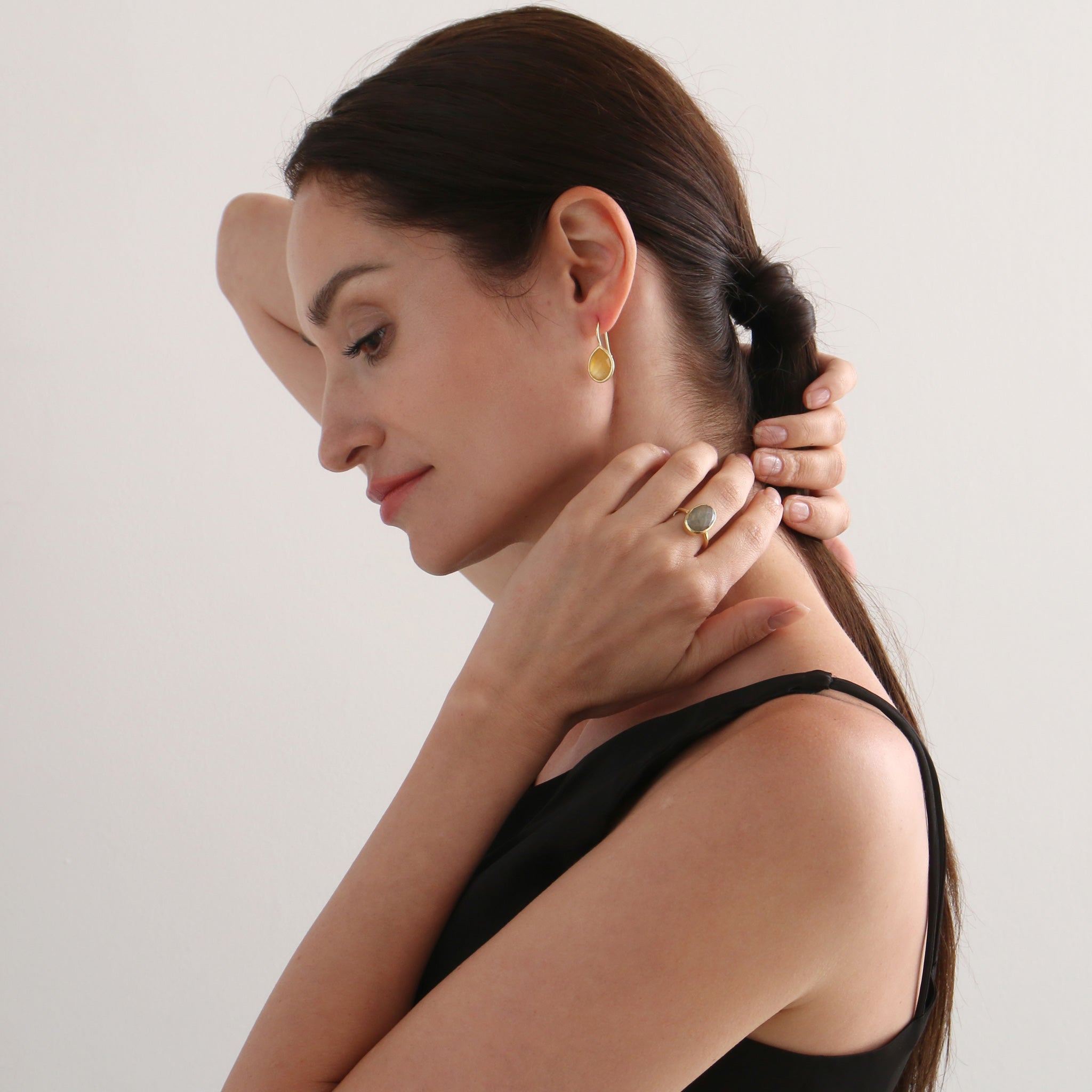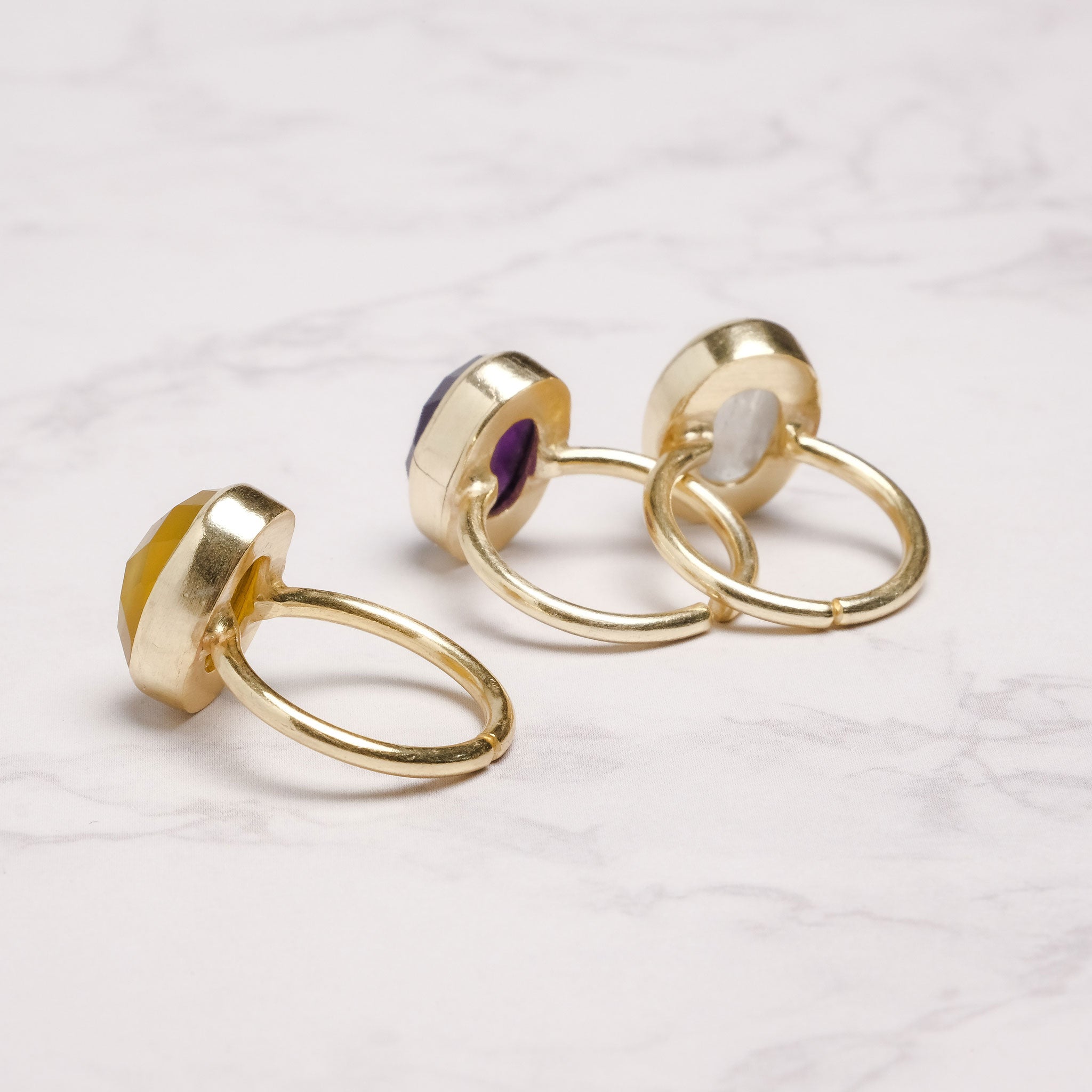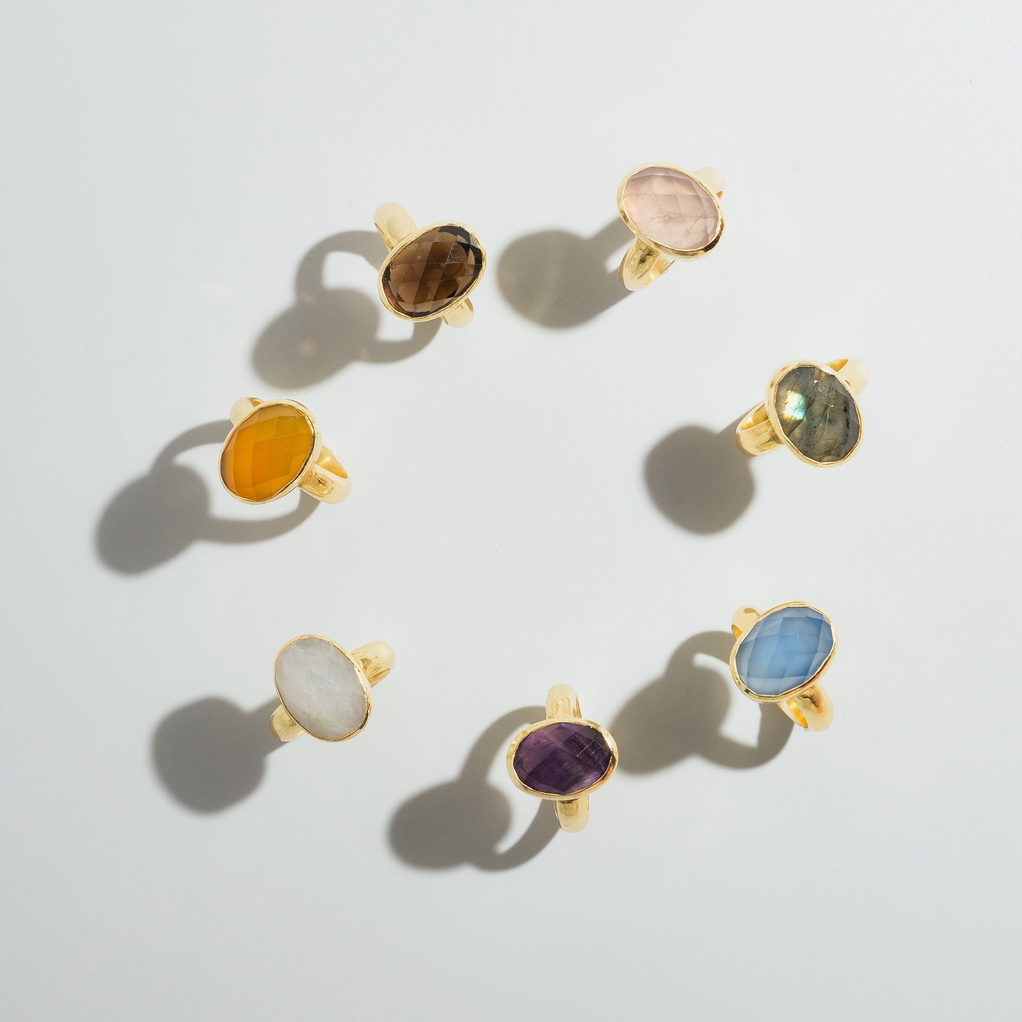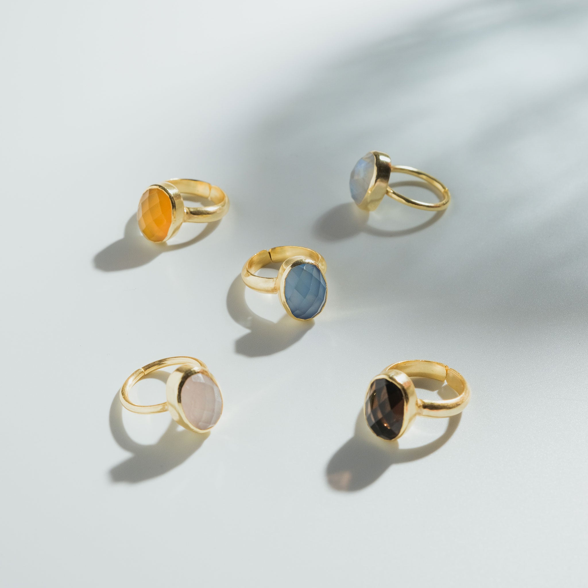 シンプルなフォルムの中に、天然石の個性と輝きが詰まったリング。光を受けるたびに異なる表情を見せるファセットカットが、指先を美しく彩ります。