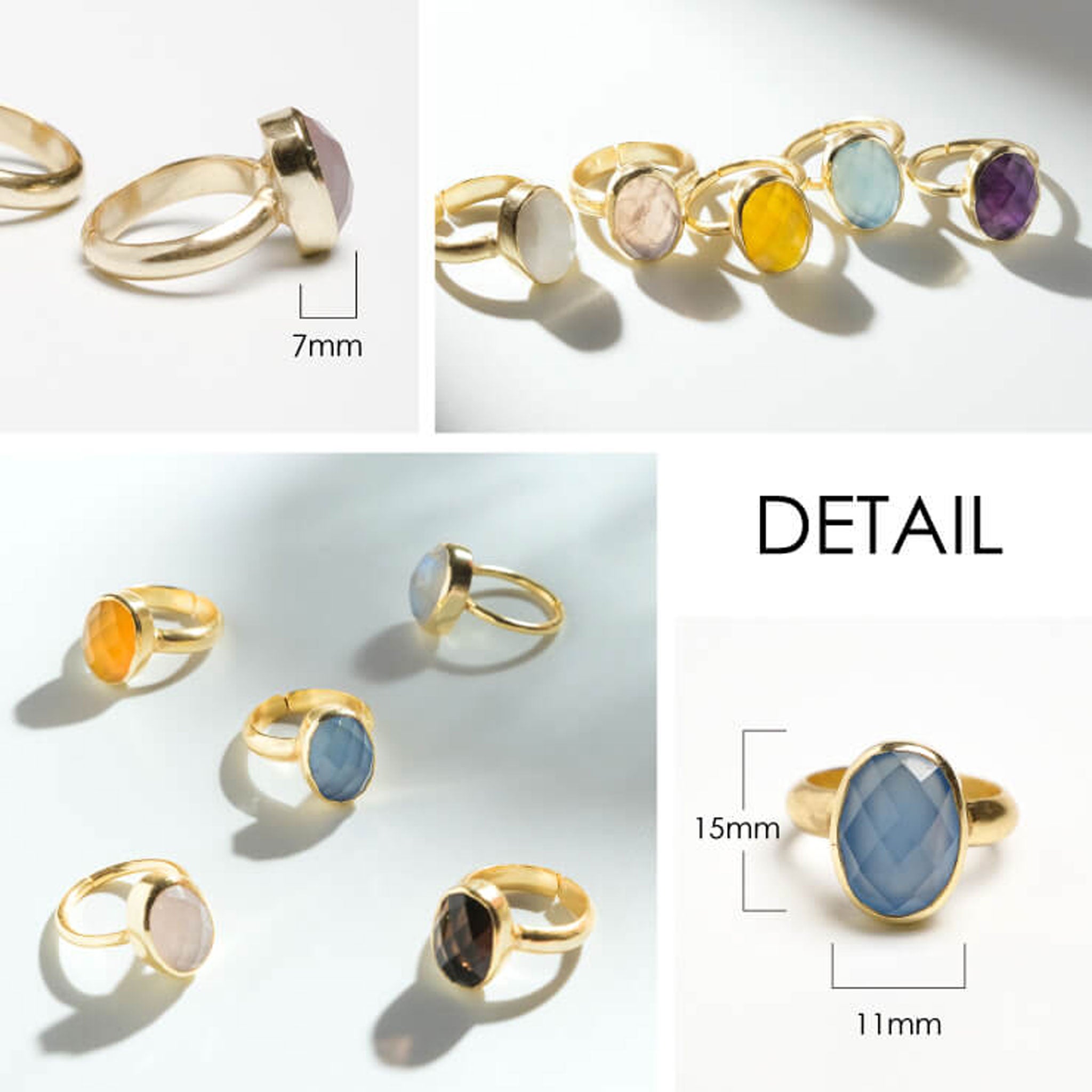 インド・ジャイプールで厳選された良質の天然石。厳選した7種類の石に キラキラと石を輝かせるカッティングを 施した華やかリング。