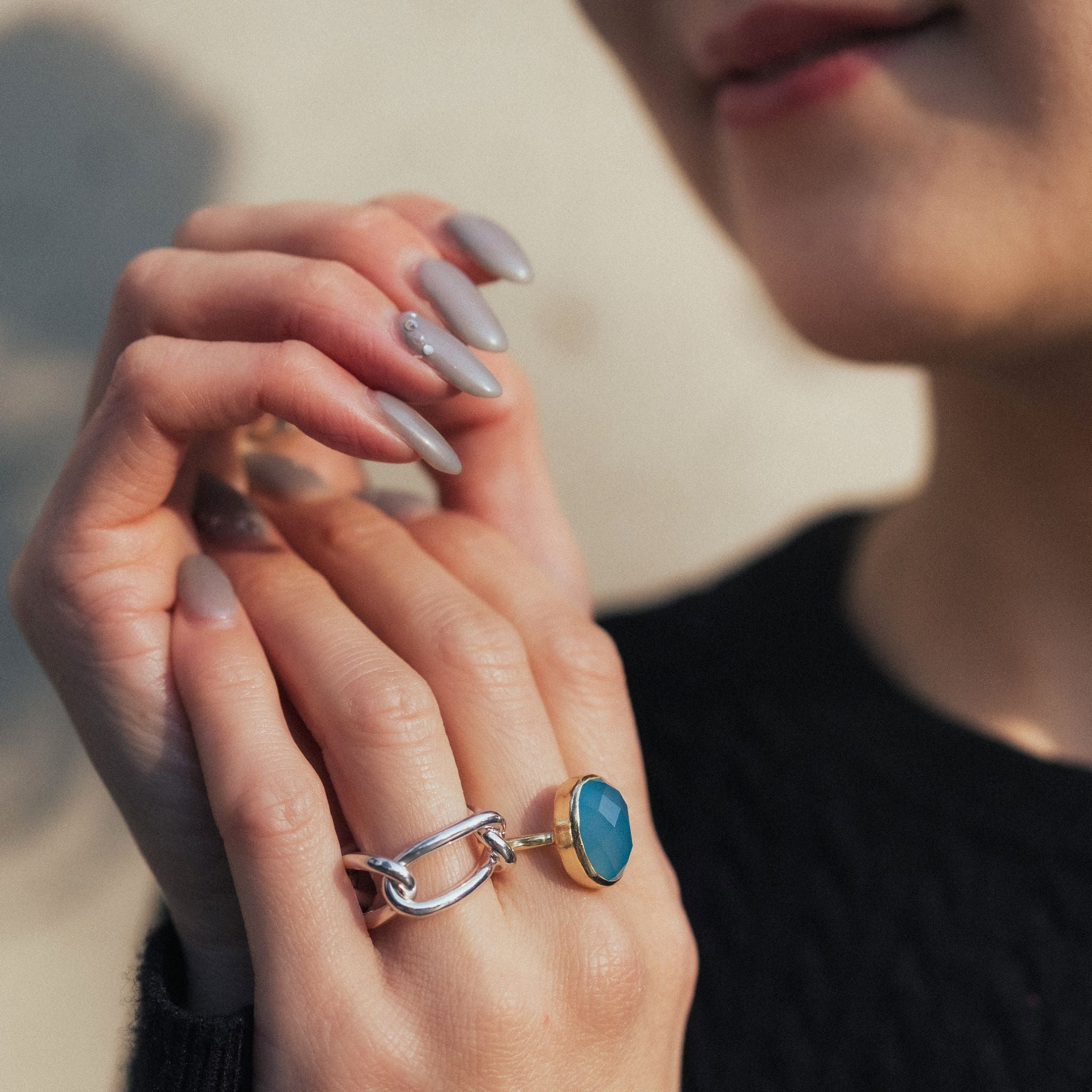 多面カット入りの天然石が、まるでアートのように輝くリング。 身に着けるだけで、シンプルなコーデも一気に洗練された印象に。