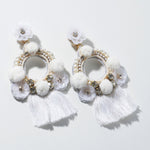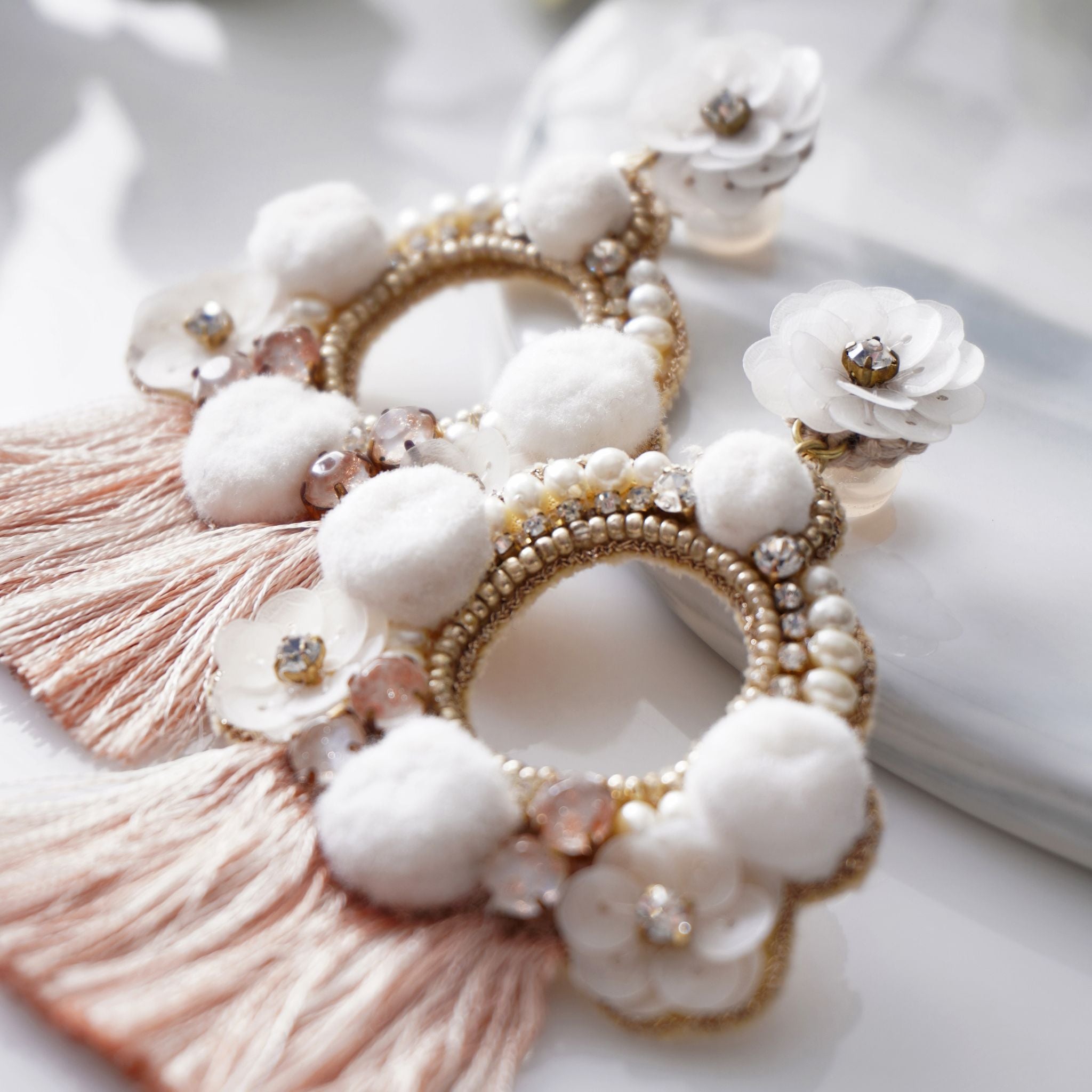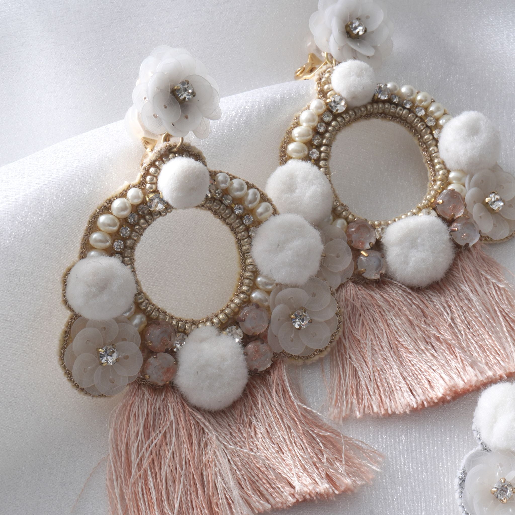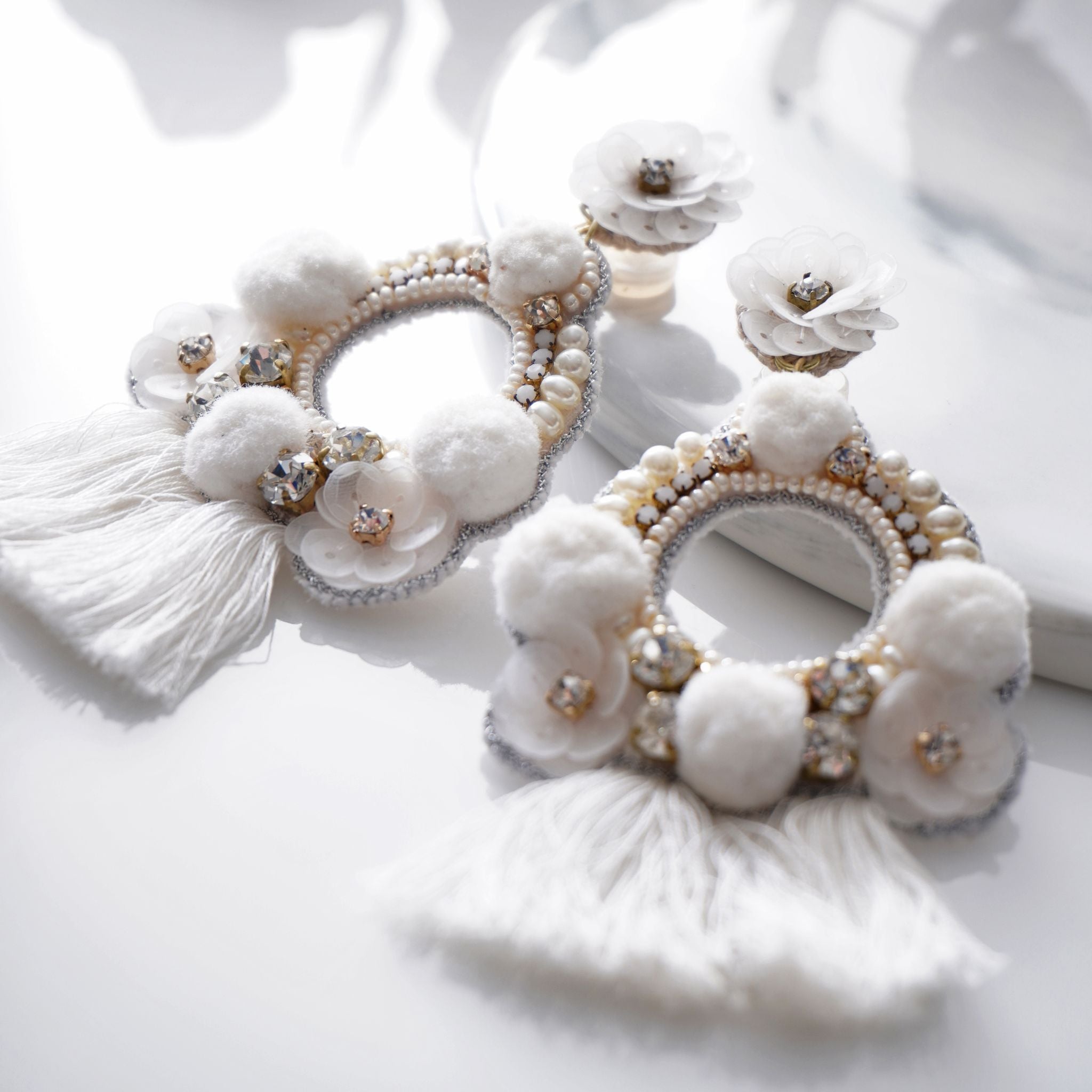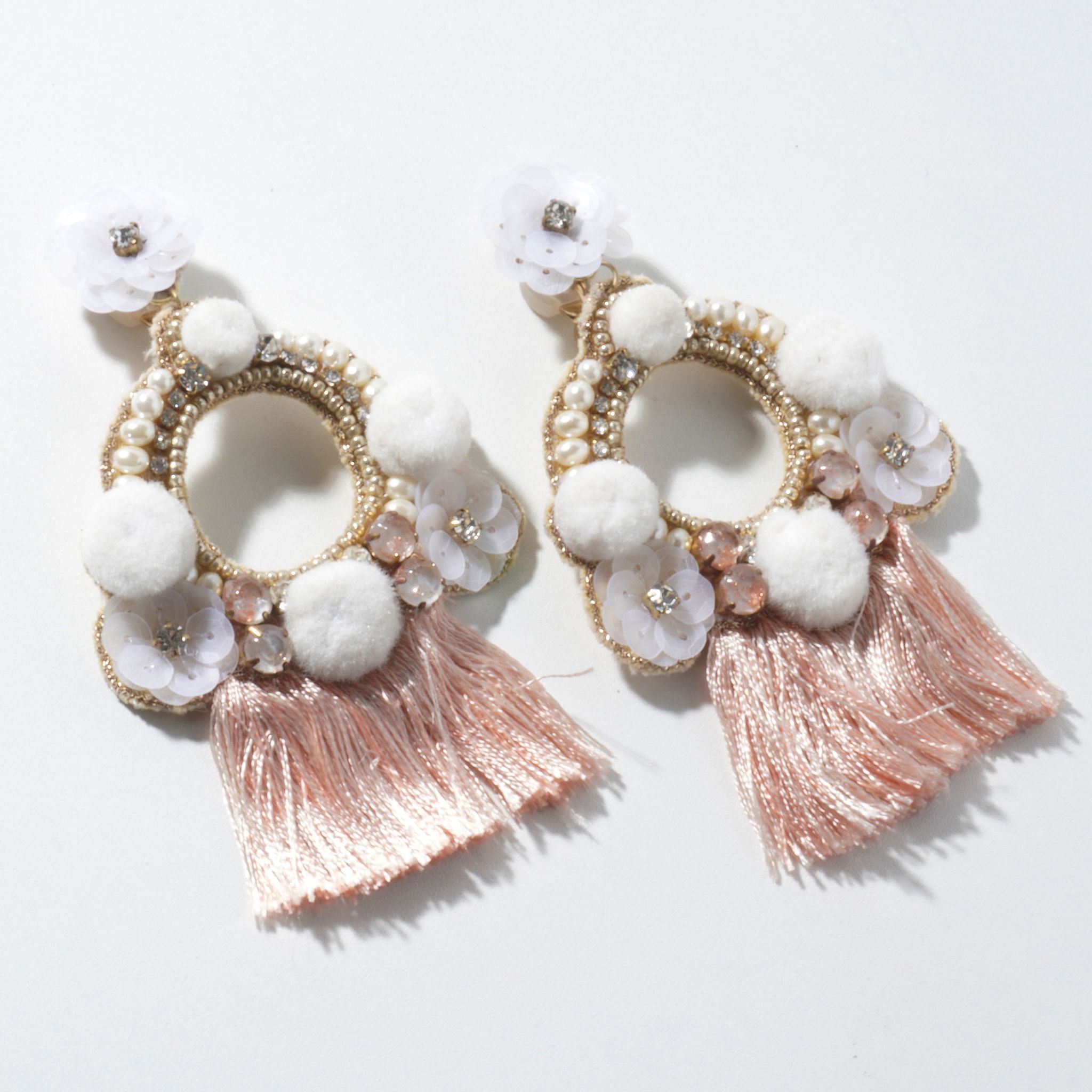 スパンコールのフラワーモチーフにポンポンやフリンジ、ビジューなどをあしらった個性的で華やかなデザイン。デザイナーのイチ押しです。